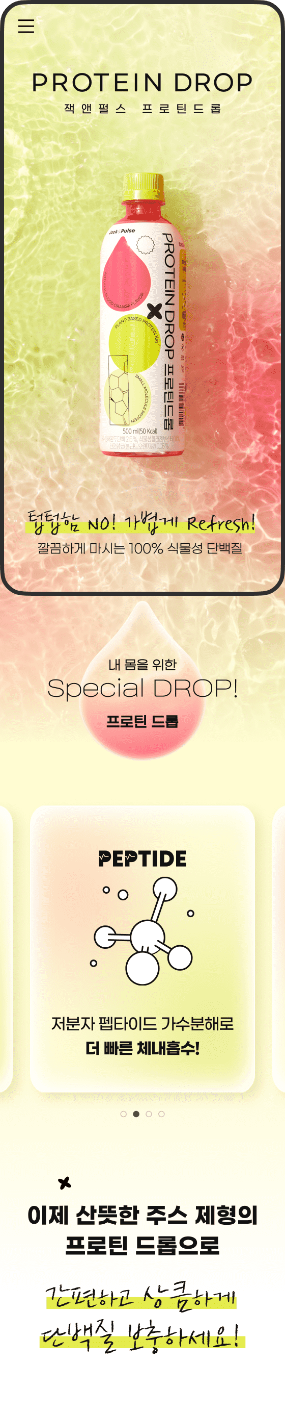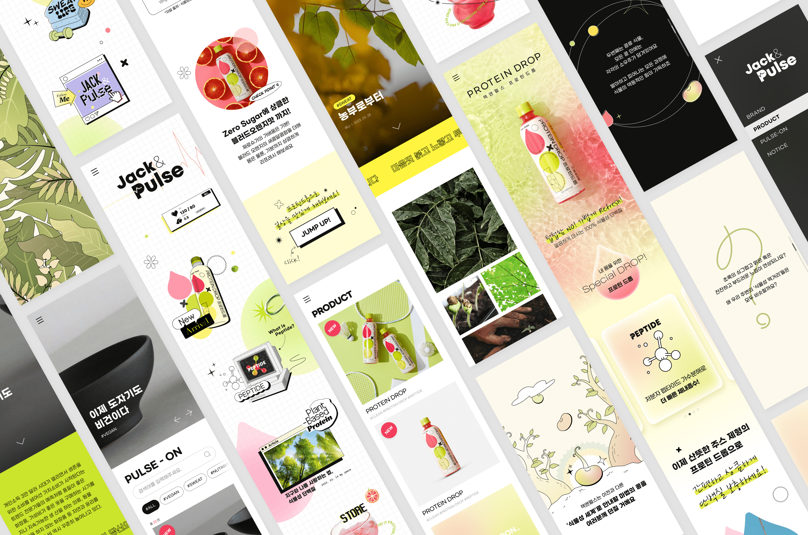 Among them, we created a website to introduce a new product brand called 'Jack&Pulse'. Using GUI images/interactions that can express Jack&Pulse's trendy and fresh brand by considering core targets, we composed content to convey the brand's newness and pleasure and to convey the value of a healthy and balanced Samyang food brand.