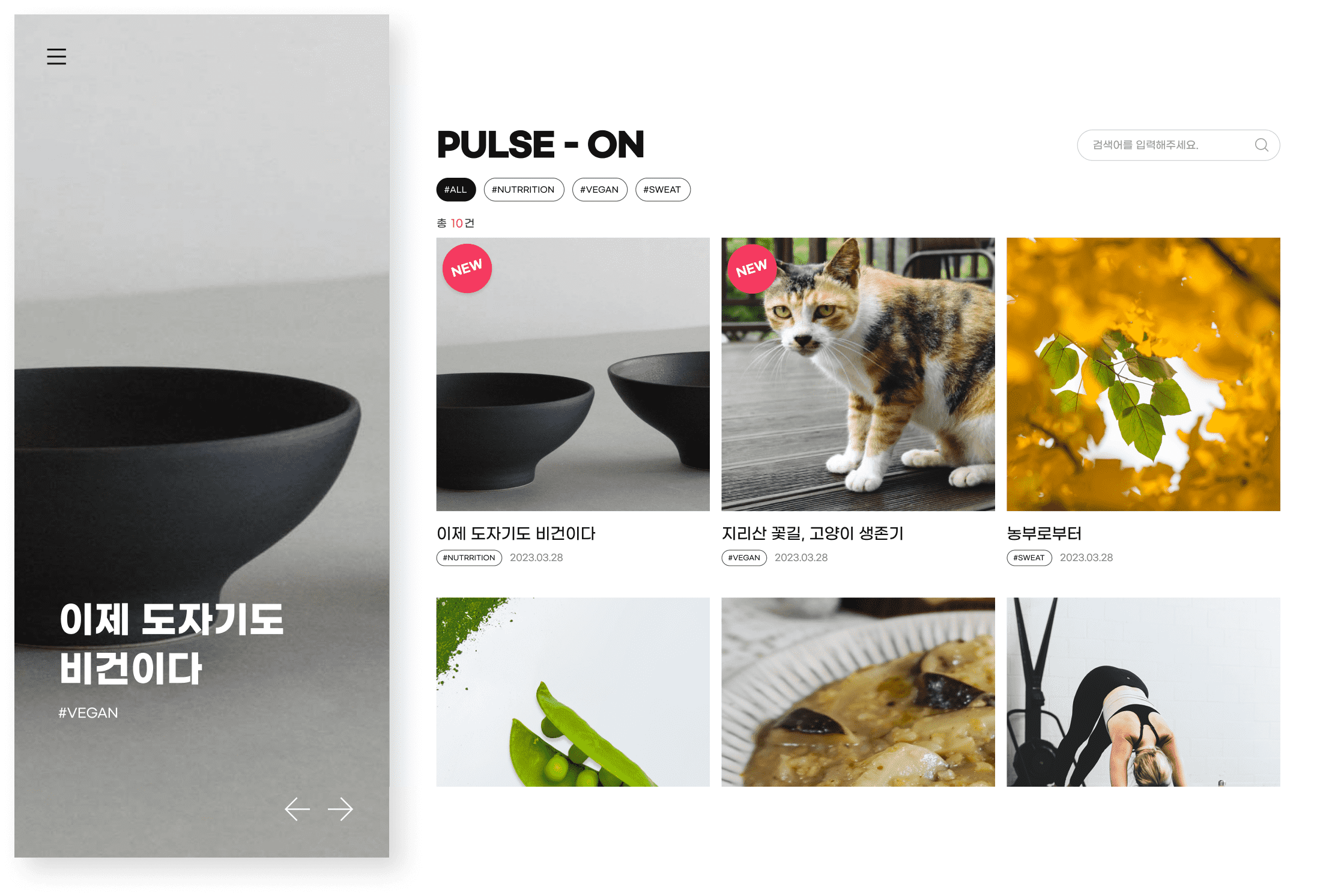 The Article menu utilizes a split screen structure to quickly check the desired content. The screen is largely divided into a banner area and a list area. The banner is designed with a vertical structure that is different from general banners, and the screen is structured so that you can quickly check the desired information through the tag function in the list area.