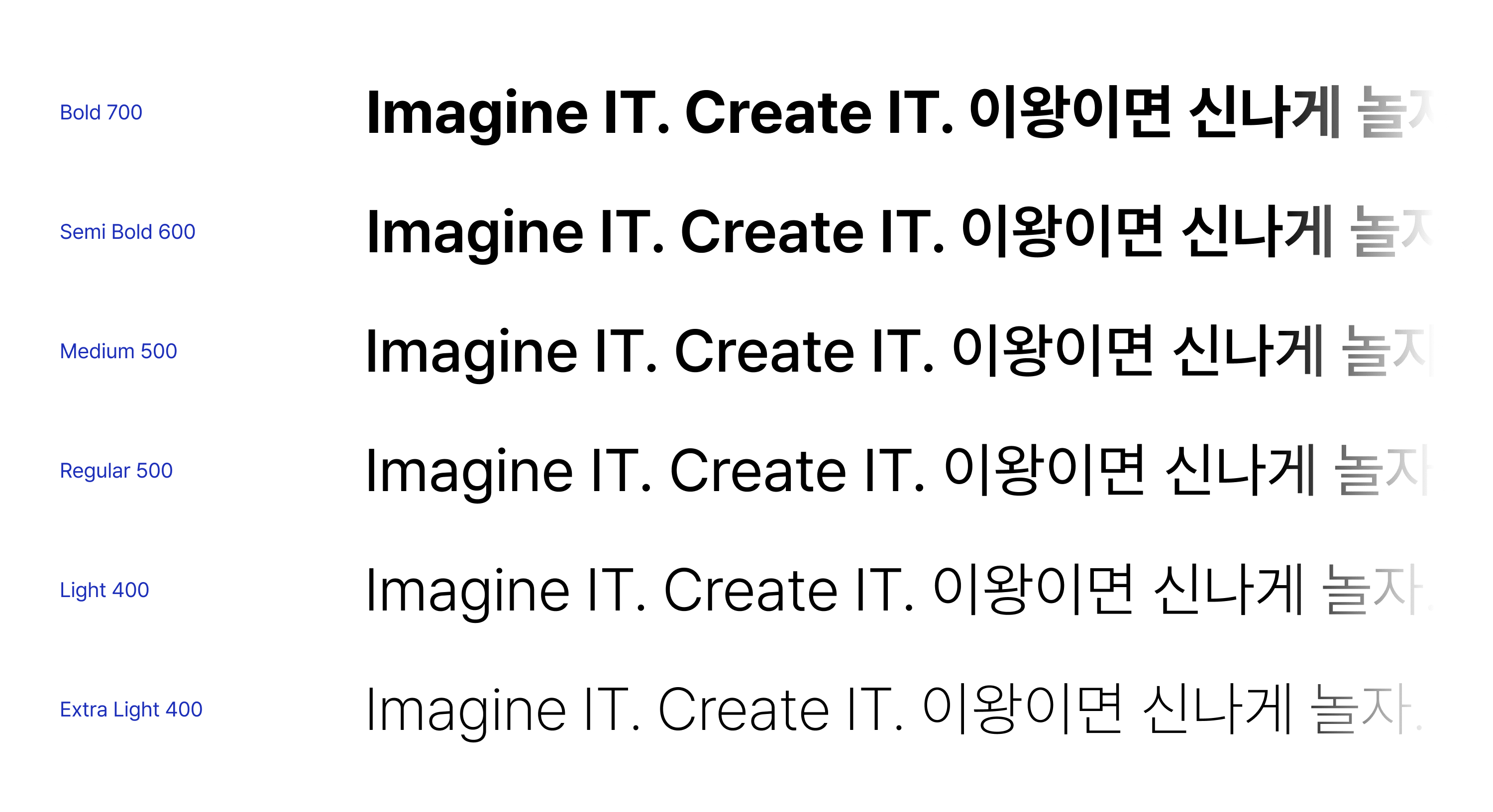 높은 가독성을 구현하는 고딕체를 사용합니다. Pretendard를 기반으로 다양한 굵기를 활용하여 정보를 효과적으로 전달할 수 있도록 Head-line, Subtitle, Body Text 등 용도에 맞게 사용되어야 합니다.
