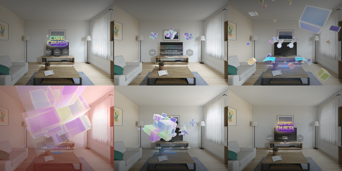 Cube Crush is an XR-based spatial defense game designed for the Apple Vision Pro device. Players dodge incoming cubes from all directions, delivering a dynamic and immersive experience. This internal project was conducted to explore and research the development process of apps and games for Apple Vision Pro.