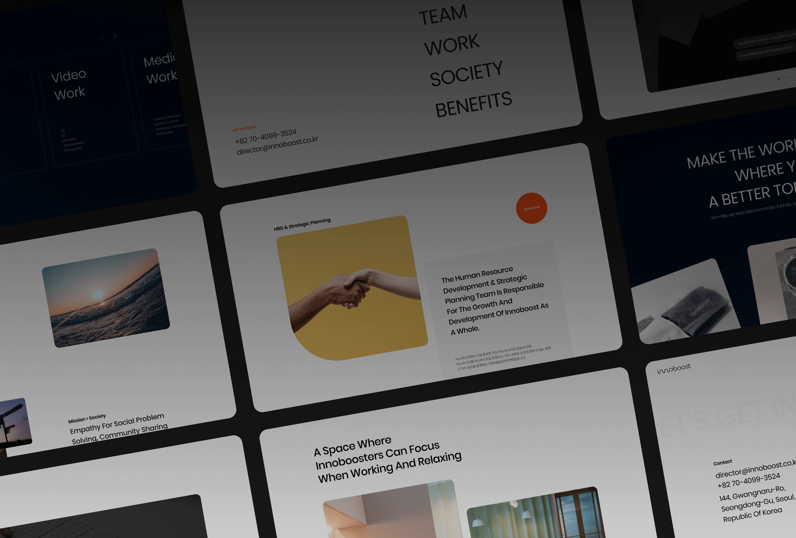 회사 소개를 정리한 ABOUT, 회사 구성원을 소개하는 TEAM, 포트폴리오를 정리한 WORK, 사내 문화와 ESG 경영을 소개하는 SOCIETY, 회사 복지를 볼 수 있는 BENEFITS 등. 각 페이지별로 콘텐츠를 정리하여 innoboost에 대한 정보 탐색을 보다 용이하게 디자인하였습니다.