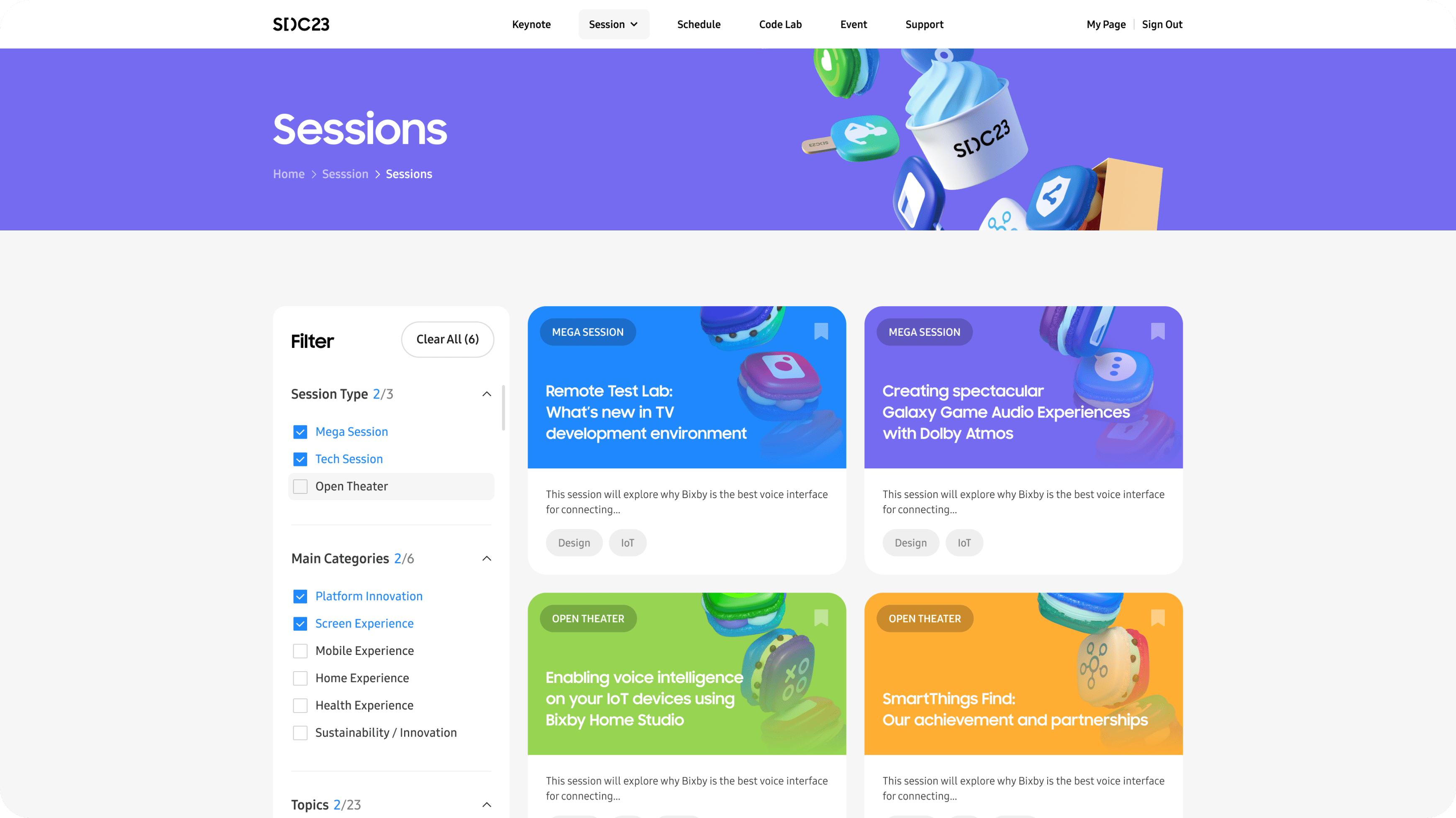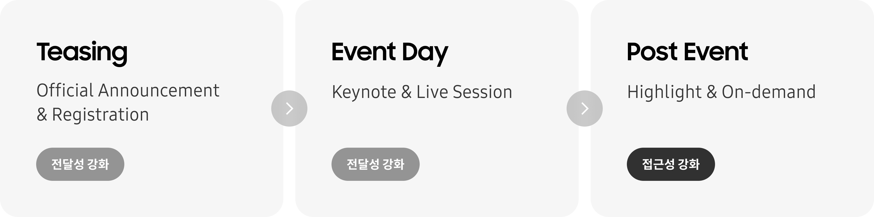Samsung Developer Conference는 행사 사이트로서, 행사의 진행 시점에 따라 사용자가 원하는 목적을 달성할 수 있는 사이트 구성이 필요했습니다.행사전/중 시점에는 사용자의 참여를 유도하는 전달성에 초점을 두고, 행사후에는 원활한 정보 탐색이 가능한 접근성에 초점을 두어 설계를 진행했습니다.