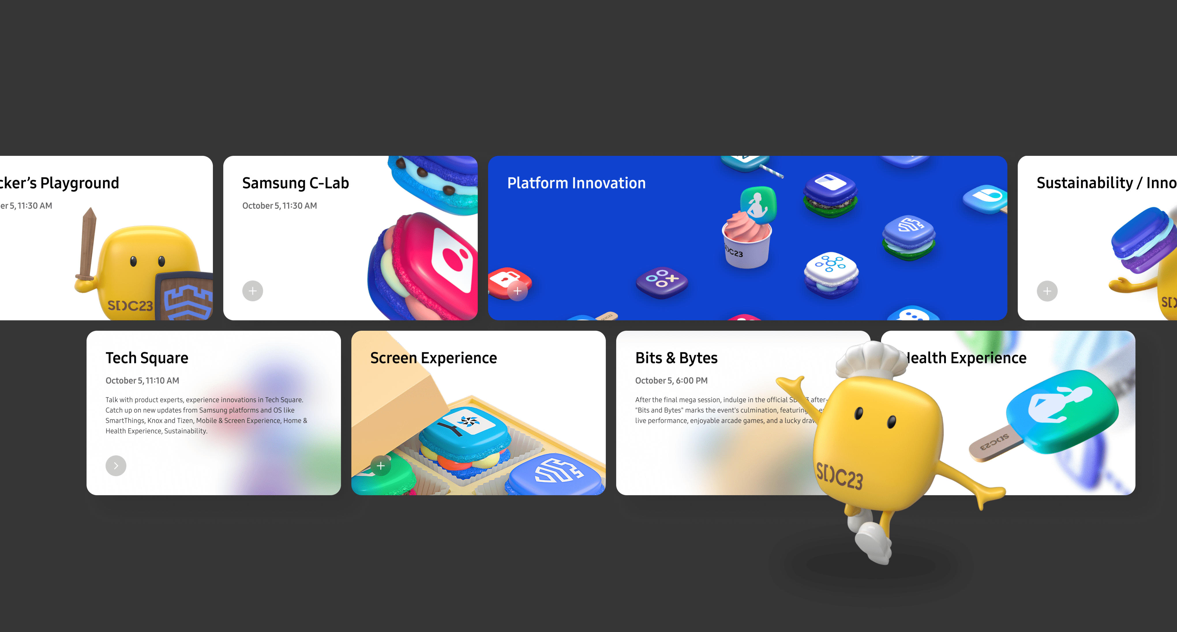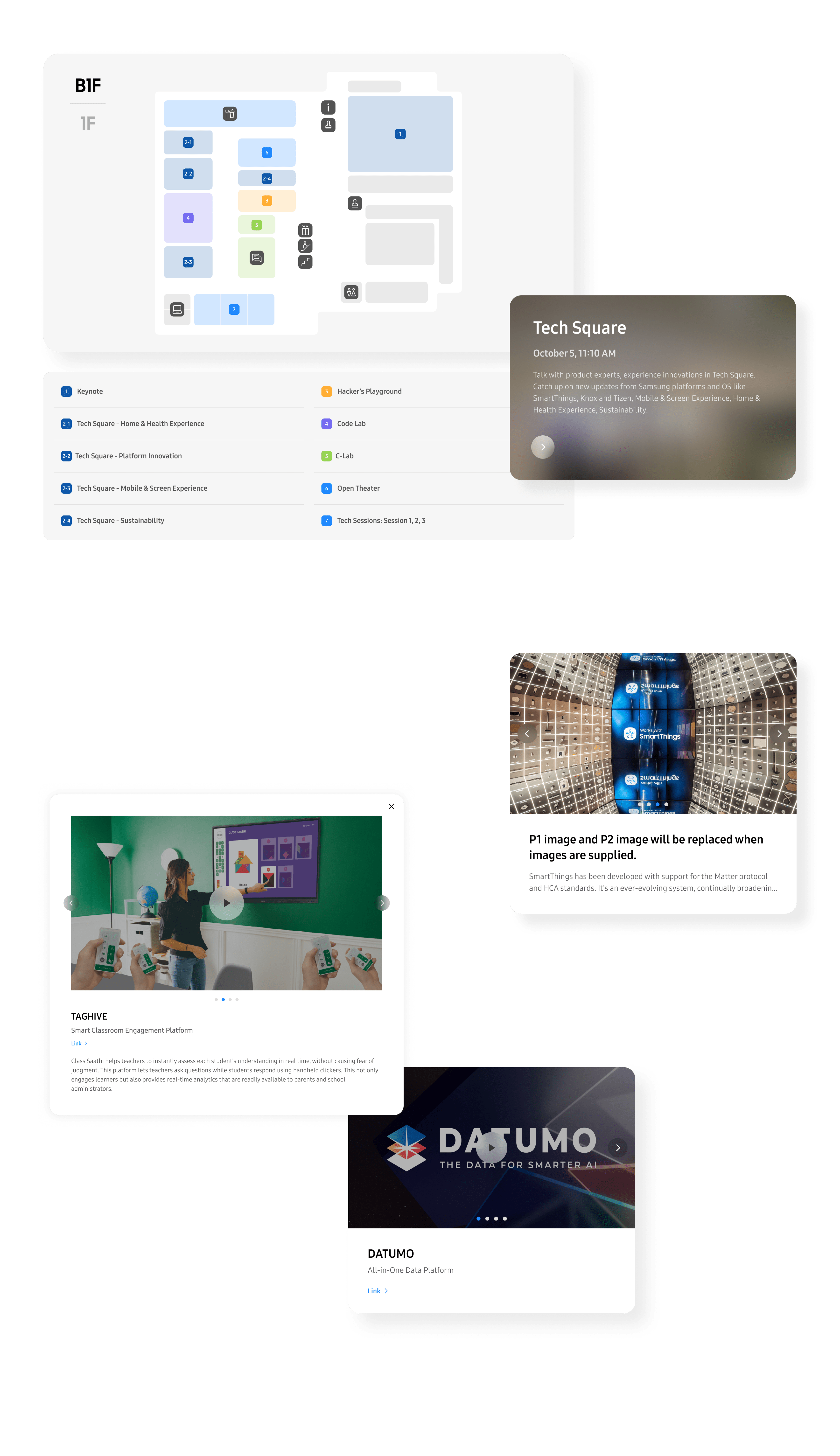 오프라인에서 경험할 수 있는 다양한 현장 이벤트 콘텐츠를 Online, On-site 참여자 모두 유용하게 이용할 수 있도록 제공합니다.주제별 전시 콘텐츠를 확인가능한 Tech Square와,삼성 기업 벤처 및 스타트업 정보를 확인할 수 있는 Samsung C-Lab 메뉴에 접근할 수 있습니다.