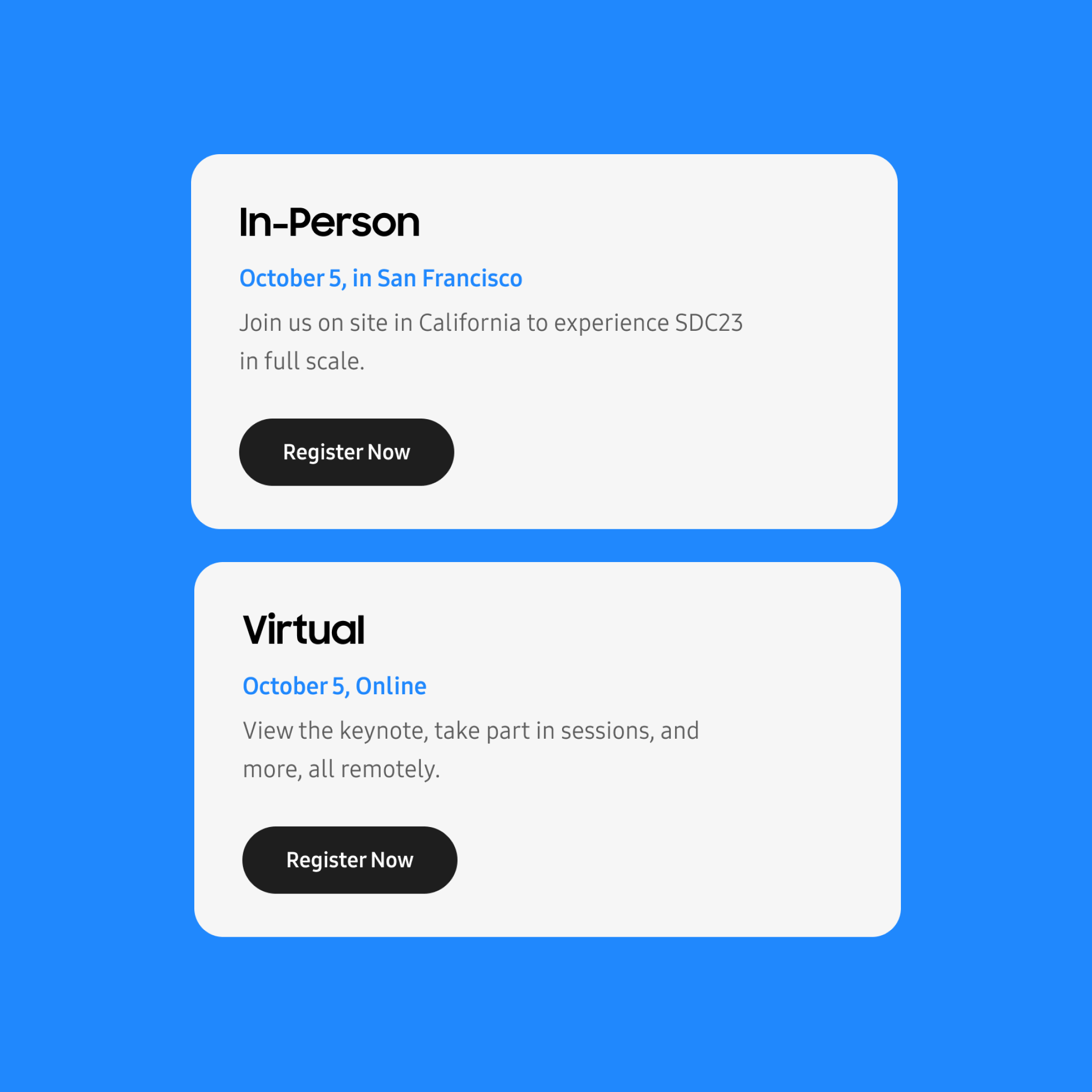 작년 대비 오프라인 참여 인원이 확대됨에 따라 행사 참여 유형에 맞는 사용성 강화, 온라인 등록 및 세션 예약 기능의 추가, 사이트의 주목도를 높이는 명료한 비주얼 표현 방식을 제공하여 하이브리드 행사 경험을 극대화 하고자 했습니다.