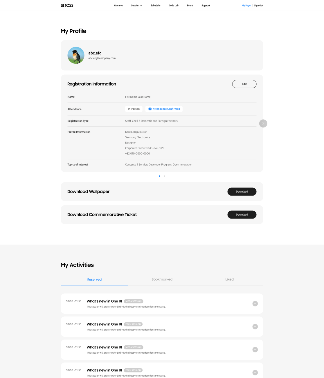 온라인 or 오프라인 행사 참여 유형을 혼선 없이 선택할 수 있도록 Online, On-site 등록 유형을 명확히 구분합니다. 행사 참여 유형에 따라, 참여 가능한 세션을 미리 예약하며, 라이브 시작 전 팝업 알림을 통해 관심 있는 세션을 놓치지 않고 시청 할 수 있도록 제공합니다.행사 참여 유형에 따라 뱃지 등의 등록 혜택 정보를 확인하고, 예약 혹은 북마크한 세션 정보를 한눈에 파악할 수 있습니다.